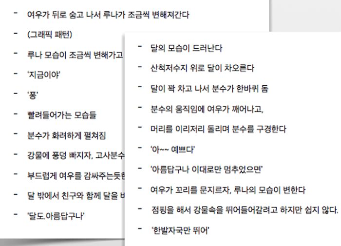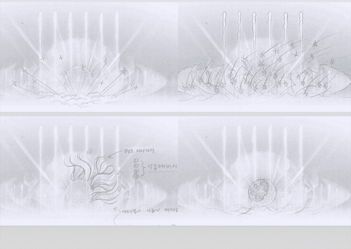 Once the synopsis and character design are completed, the design for each scene is finalized through the storyboard.