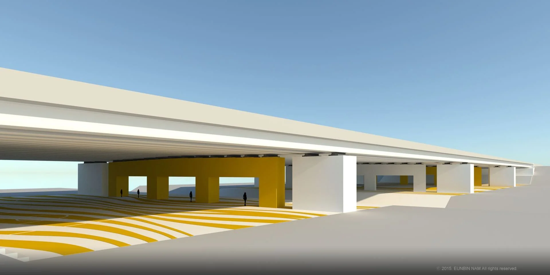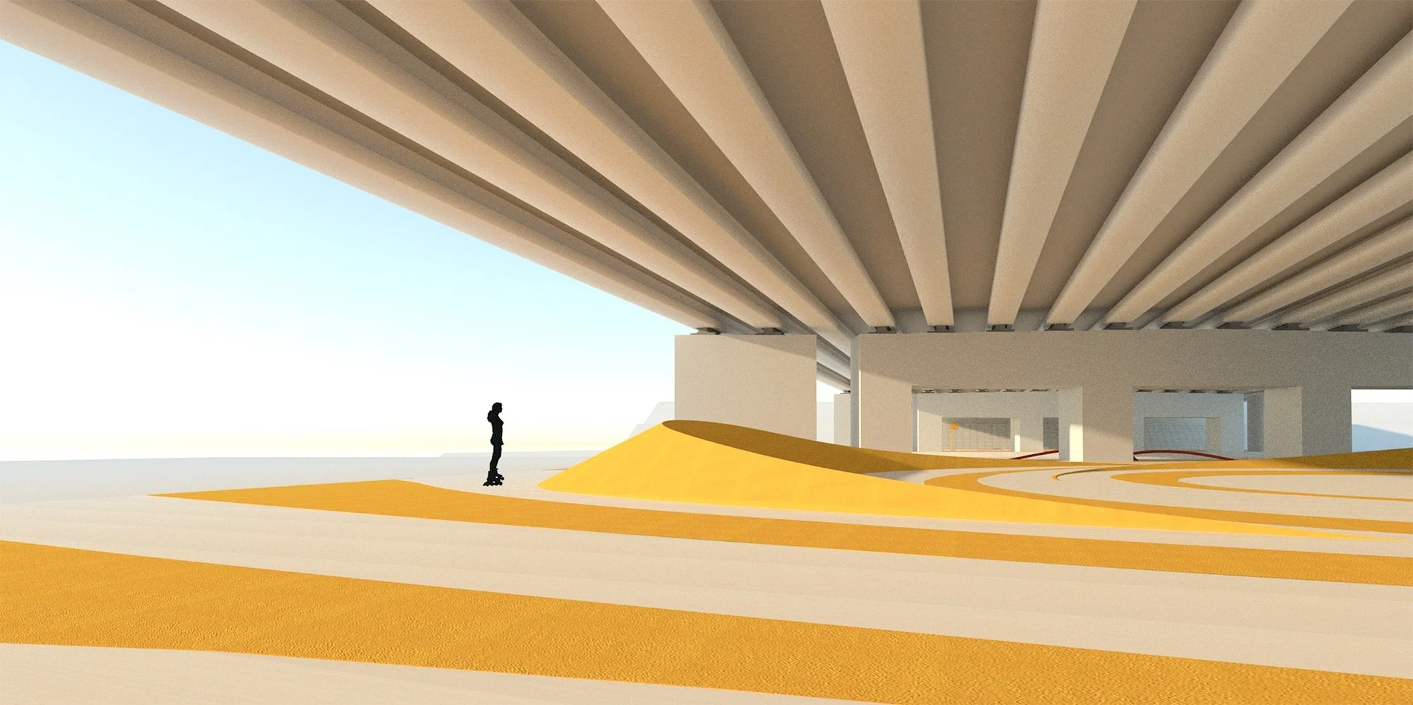 This project was conceived as part of a broader social program aimed at revitalizing the city's alienated spaces through innovative locational design. By reimagining underutilized areas, such as the space beneath the bridge, "Gravity Park" demonstrates the potential for transforming neglected urban environments into thriving community hubs. The visual design of the location plays a crucial role in magnifying the sense of integration between the movement of people playing sports and the surrounding environment. As visitors enter the park, they are absorbed into the circles that define the space, and their perception merges with the optical illusions created by the objects around them. This overlap of viewpoint and illusion enhances the immersive experience, creating a stronger sense of being part of a shared, dynamic environment. Through its inventive design and social purpose, "Gravity Park" serves as a model for how creative interventions can rejuvenate urban spaces and foster a sense of community and engagement among city residents.